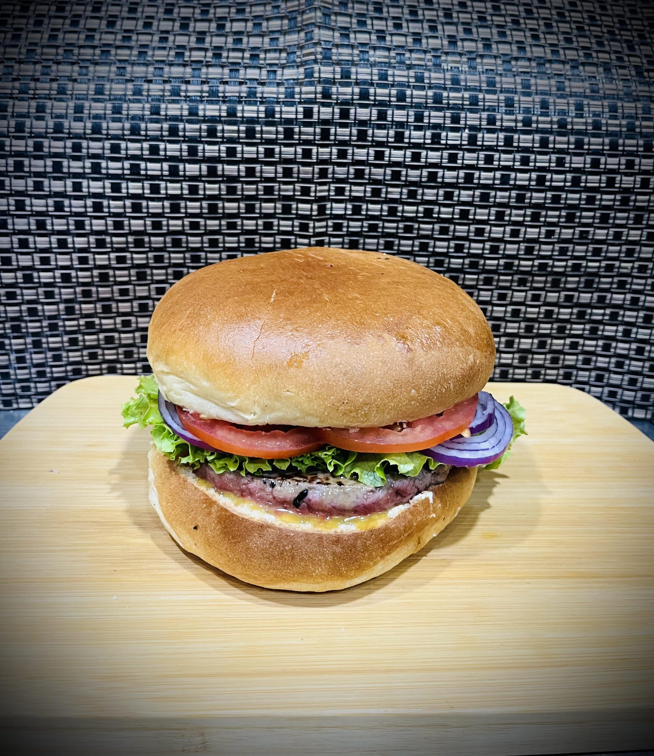 Bœuf, cheddar, tomate, salade, oignons rouges, moutarde miel, crème, de fromage.